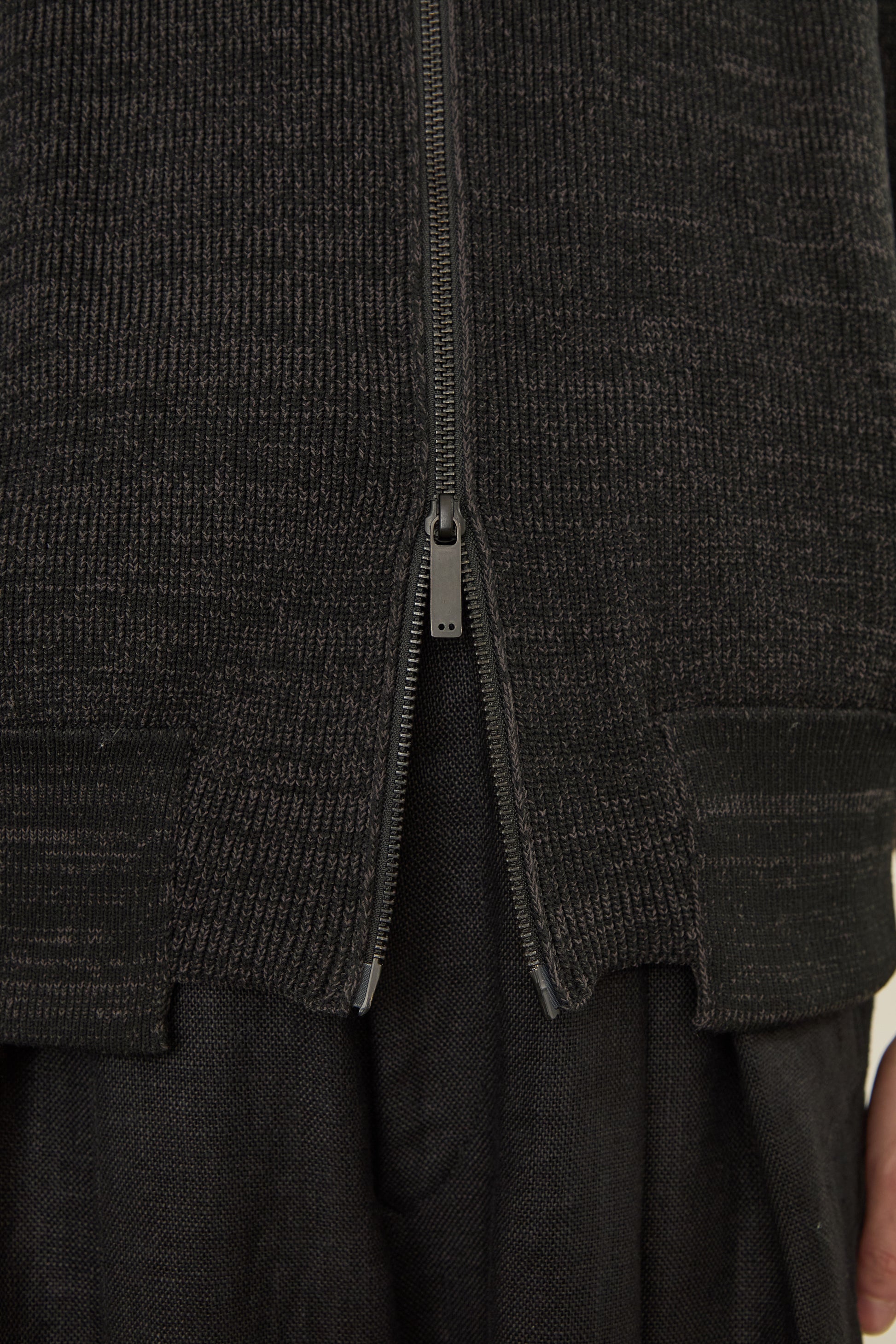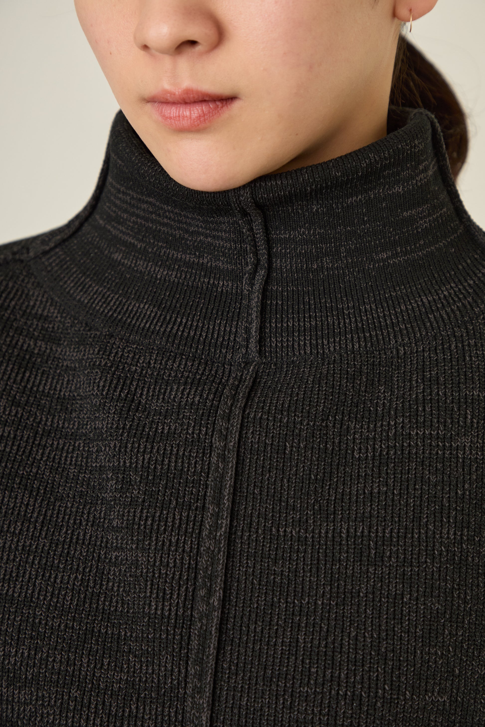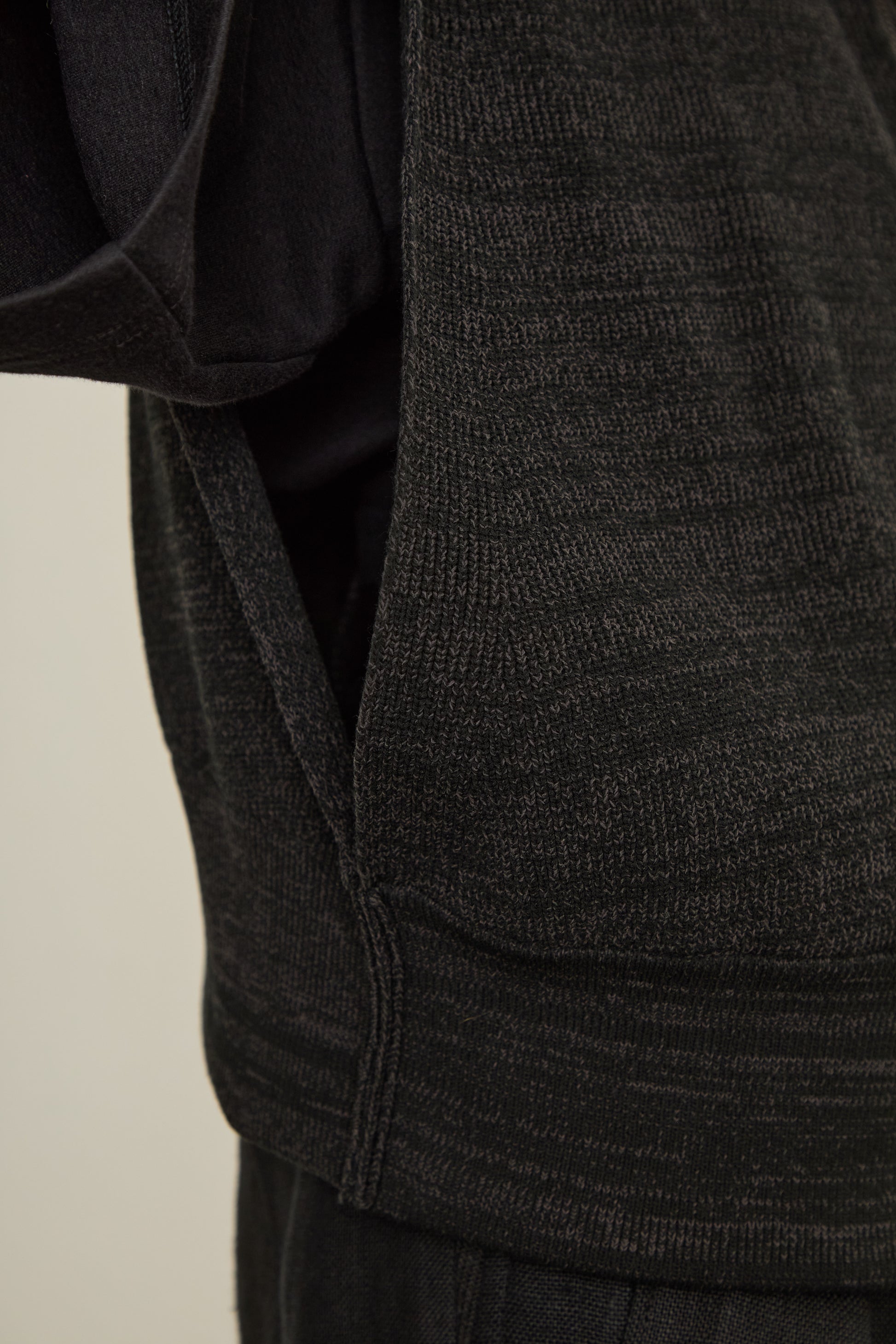 トーンに差異のある糸を2本、引き揃えながら方畦組織で編み立てました。