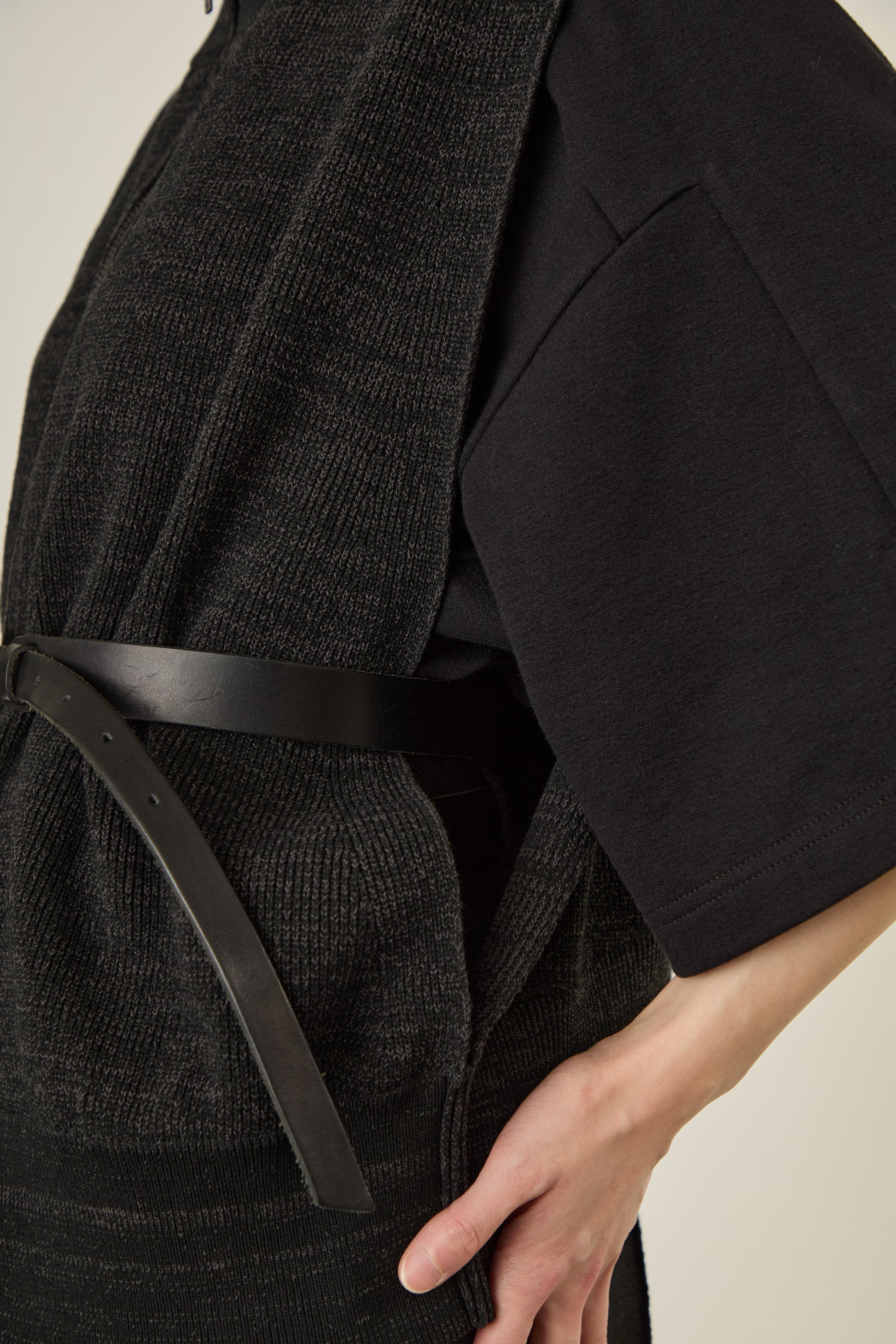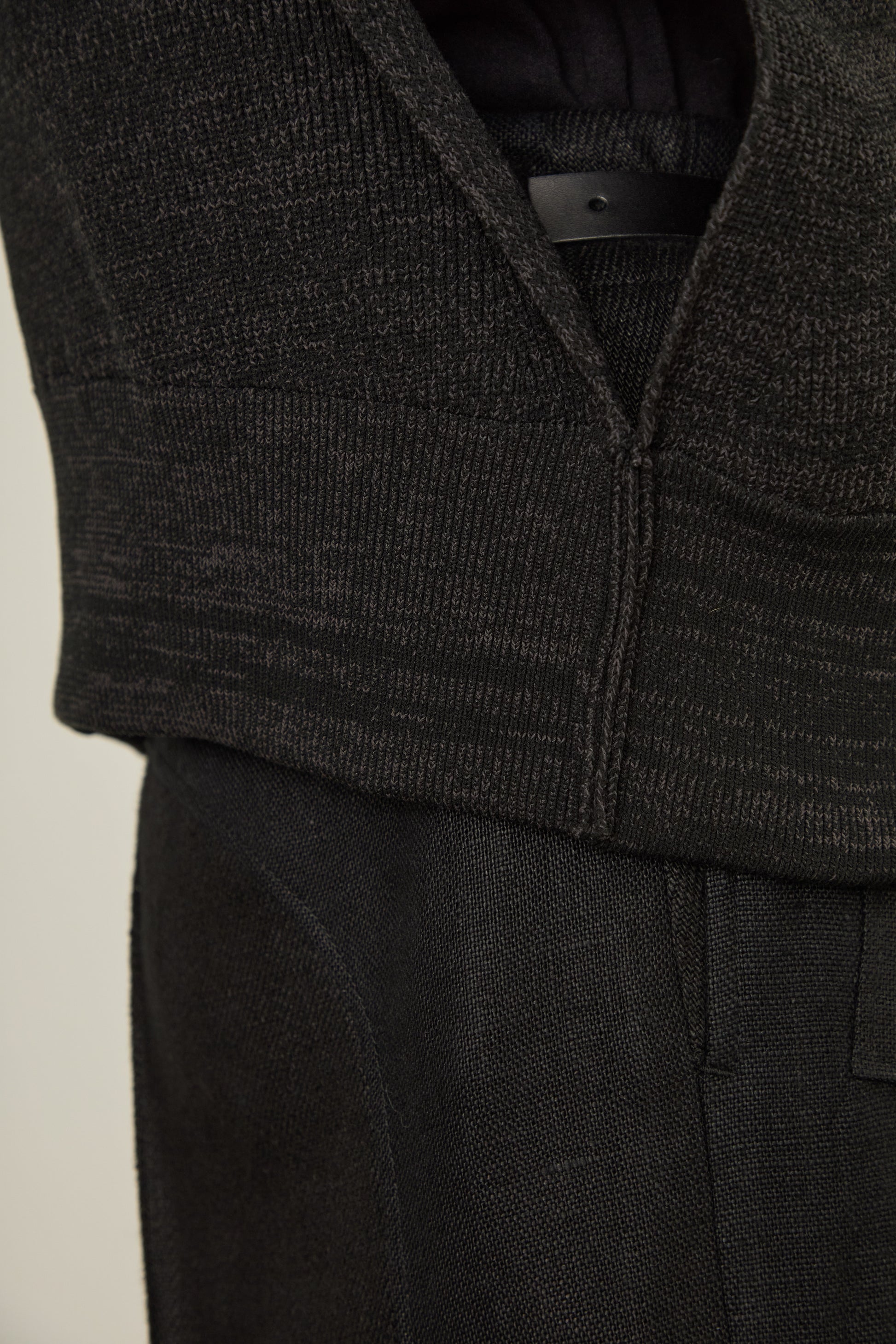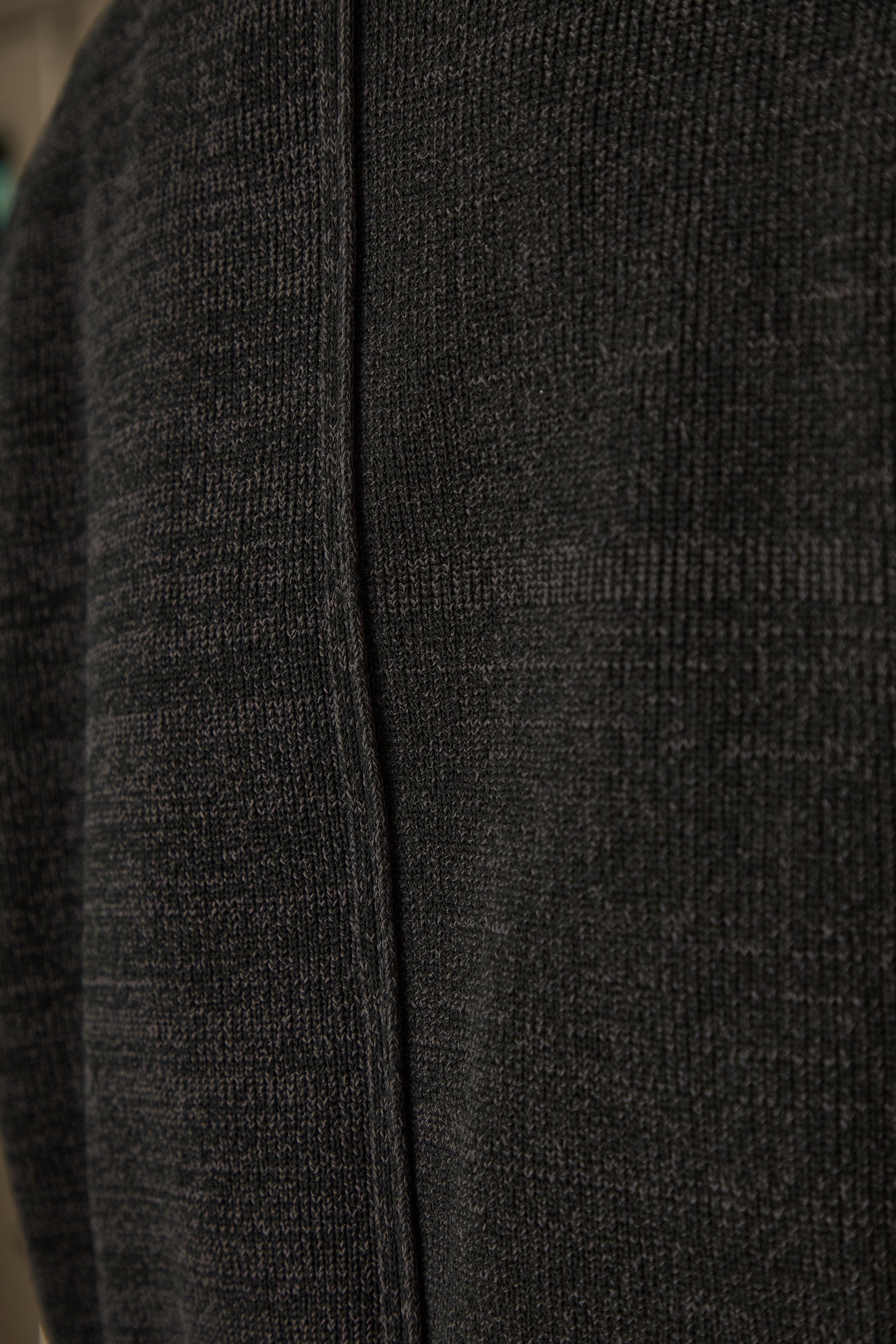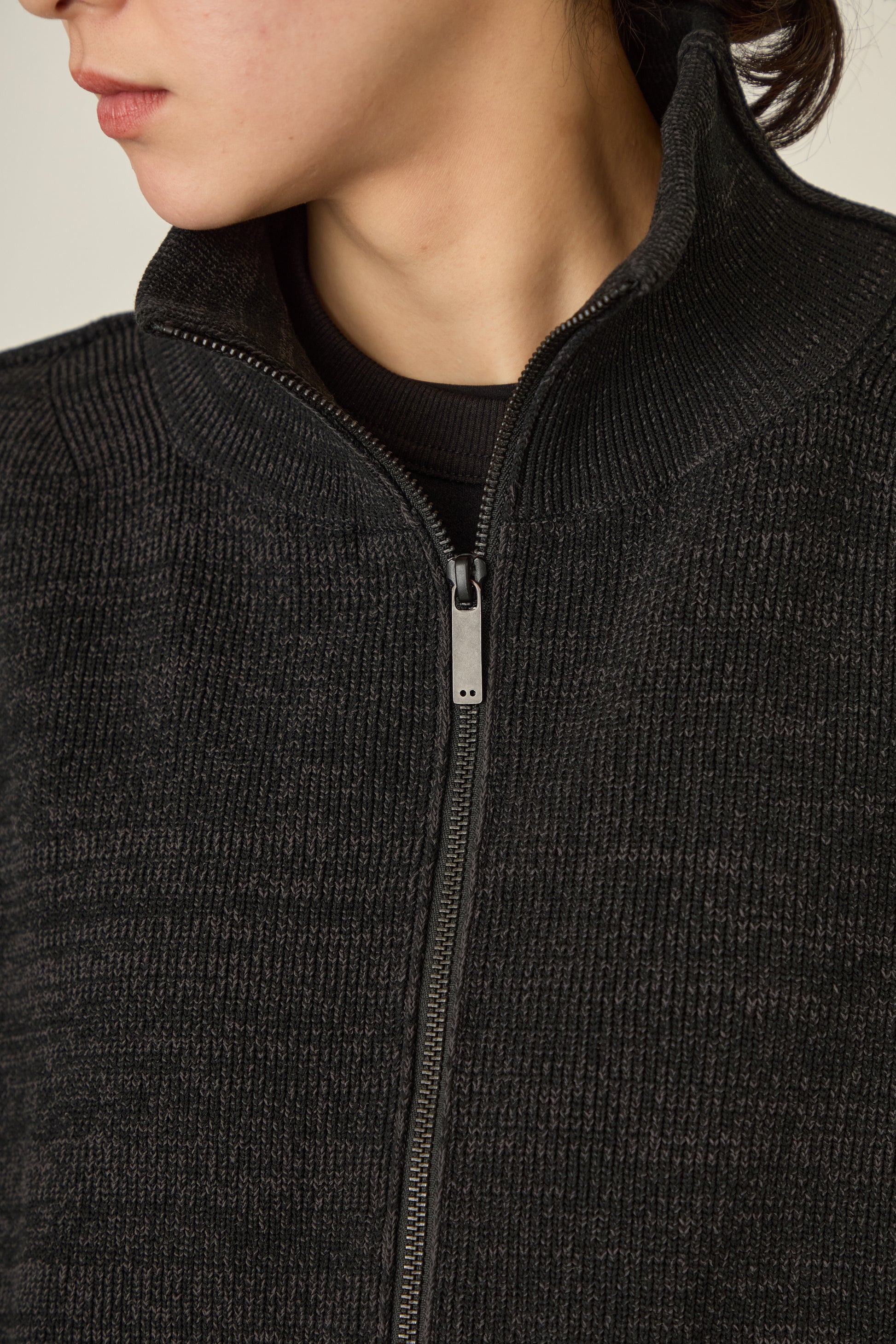 トーンに差異のある糸を2本、引き揃えながら方畦組織で編み立てました。
