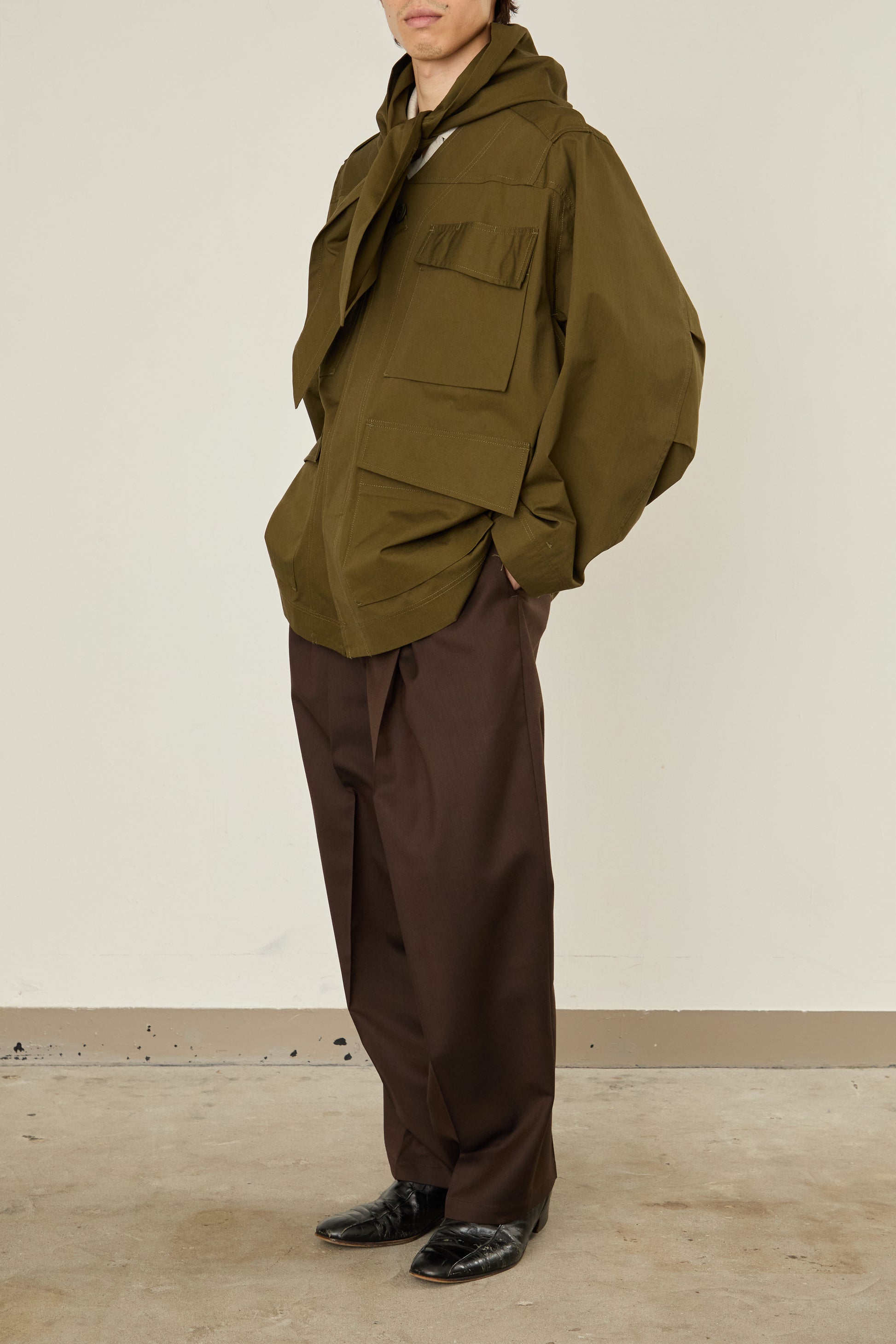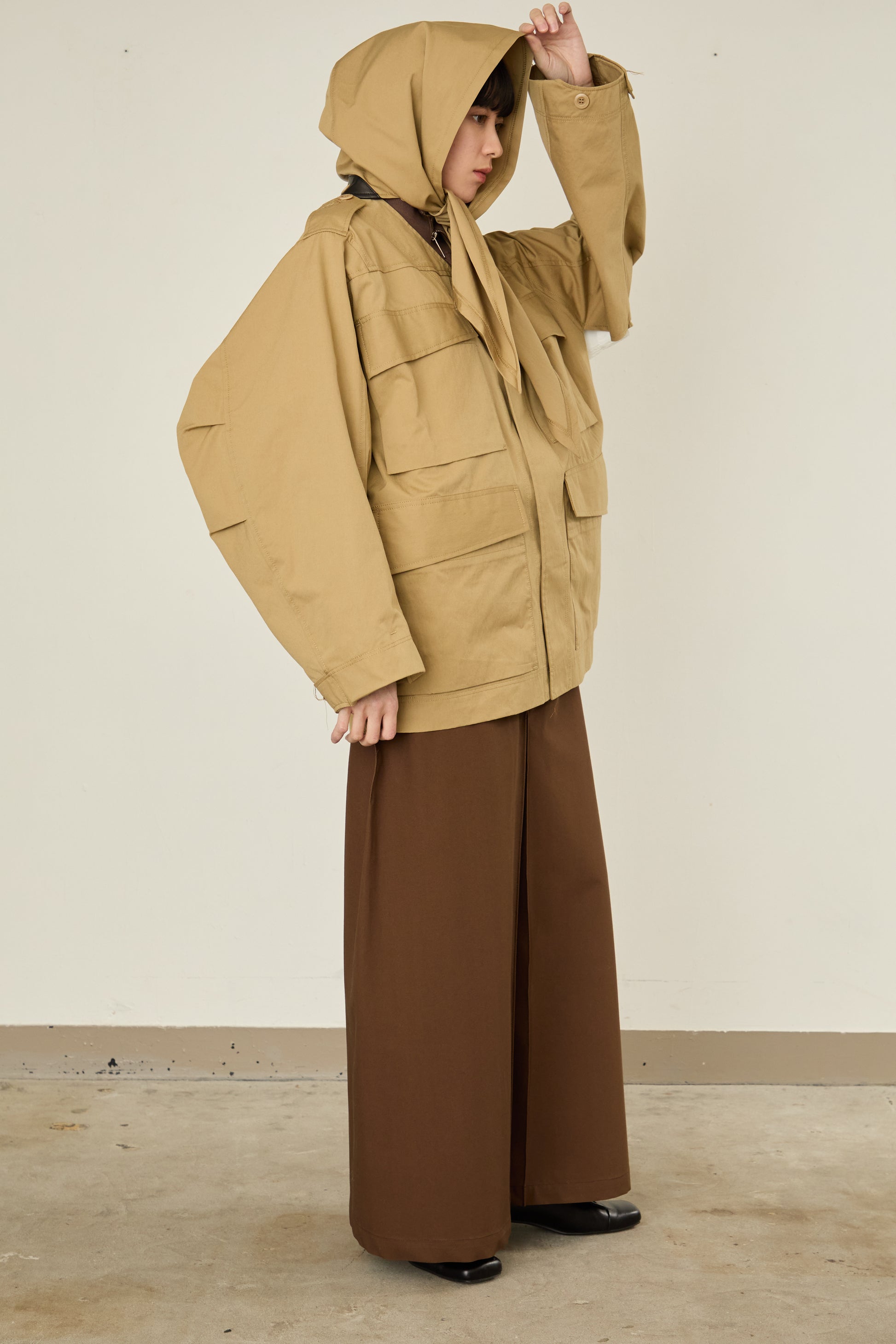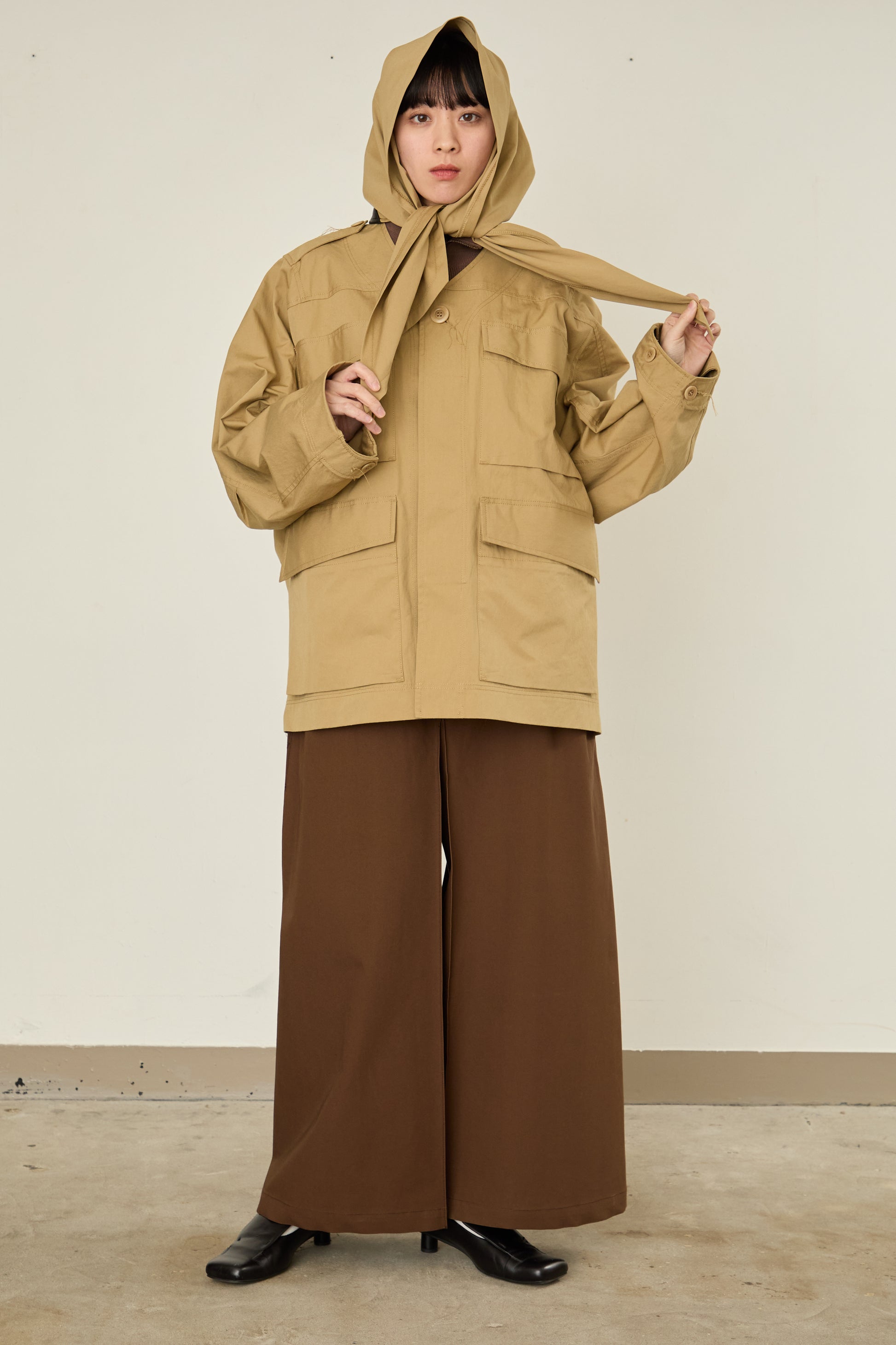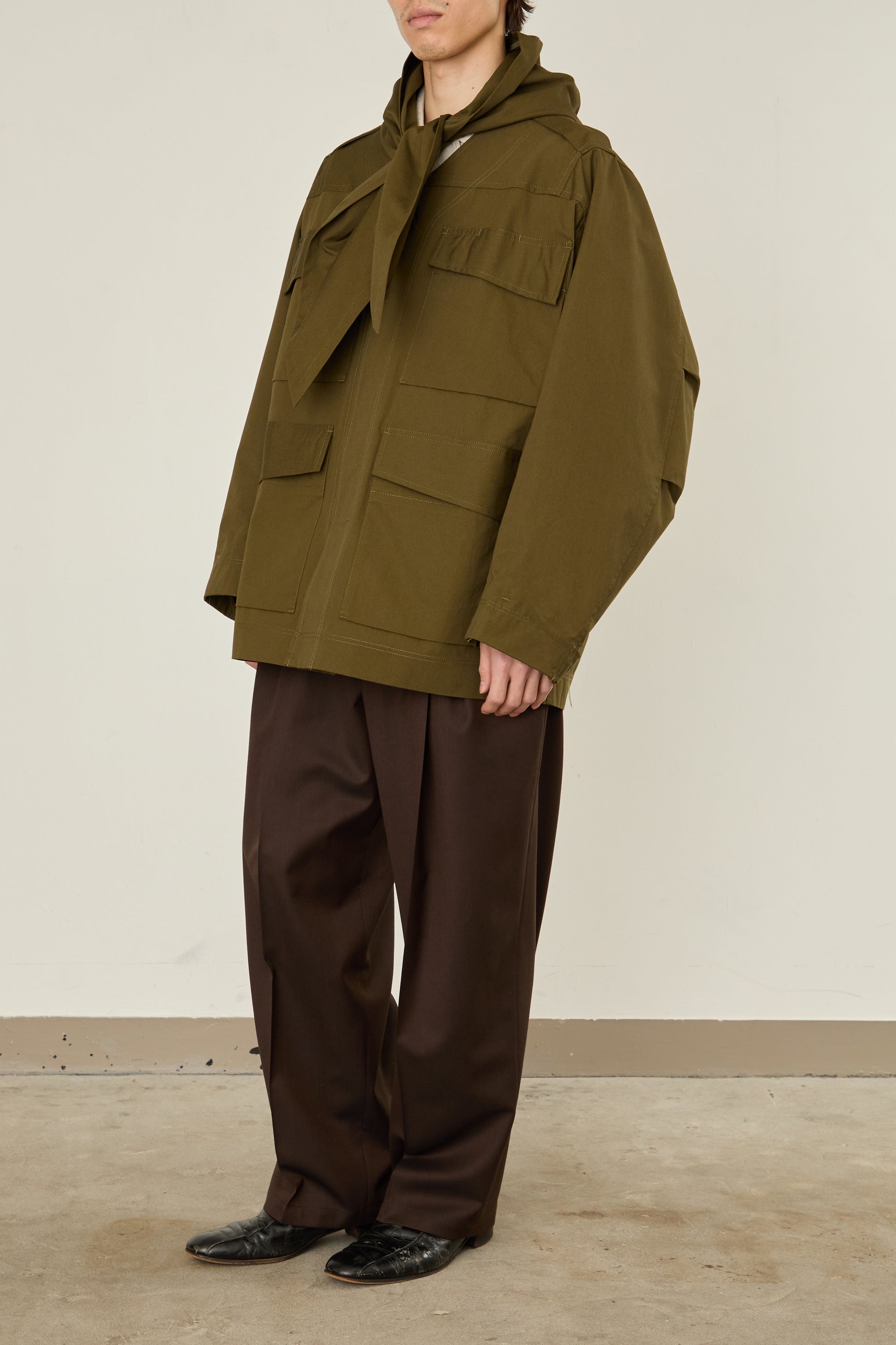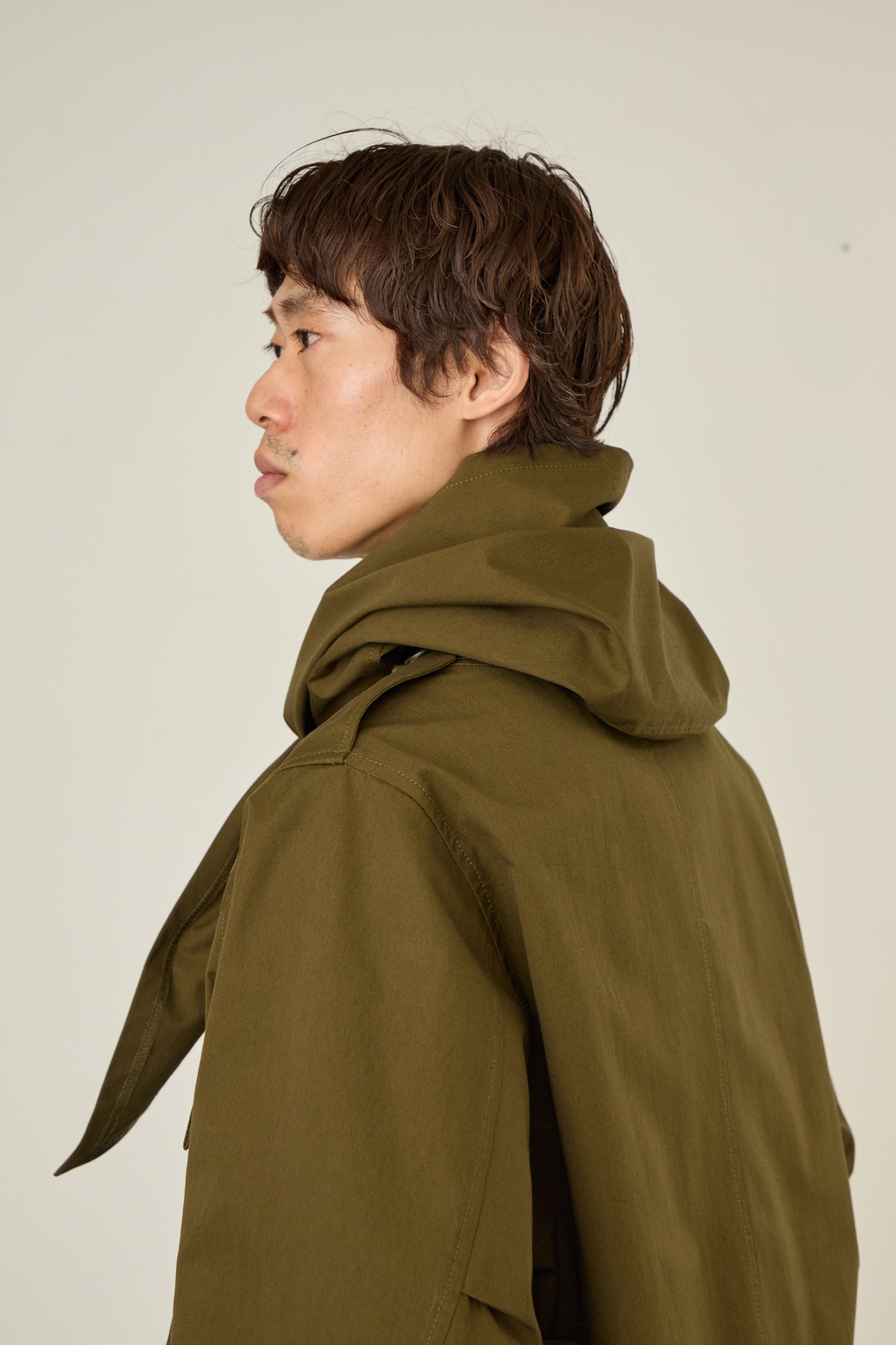 フード型ストールがドッキングされた、2WAYミリタリージャケット。