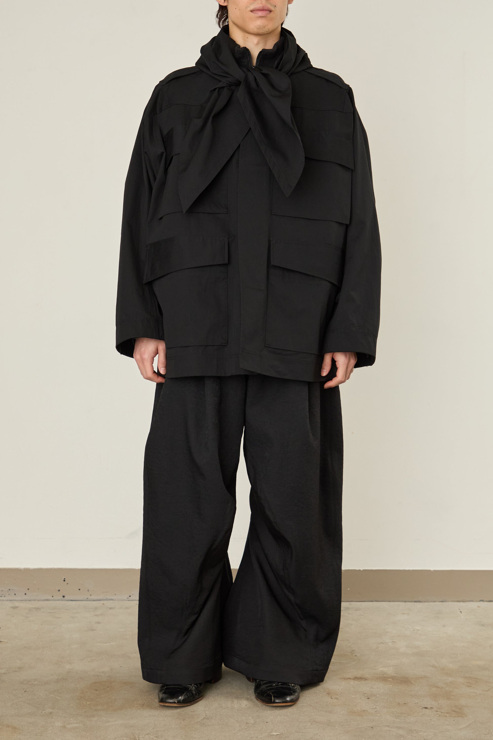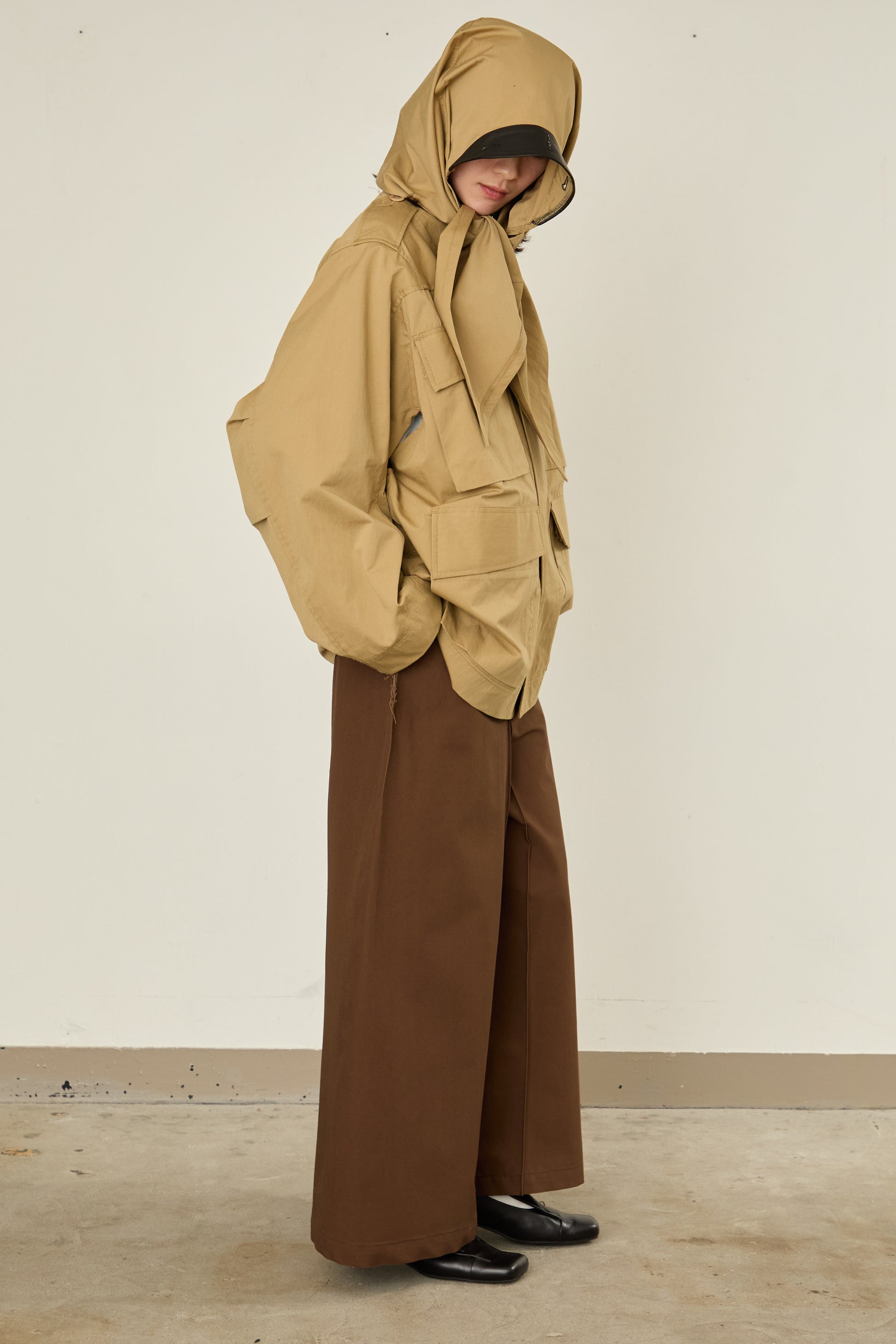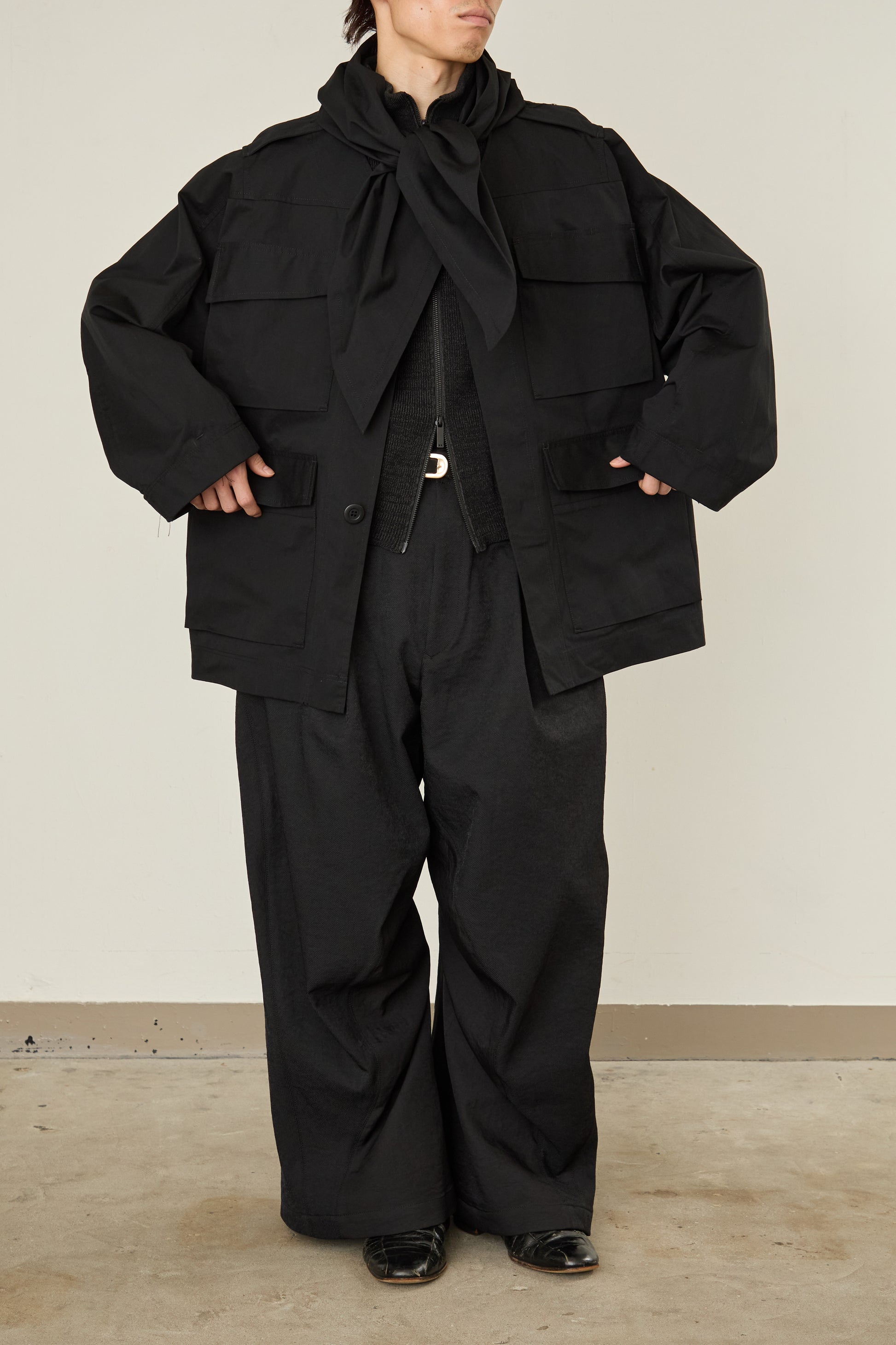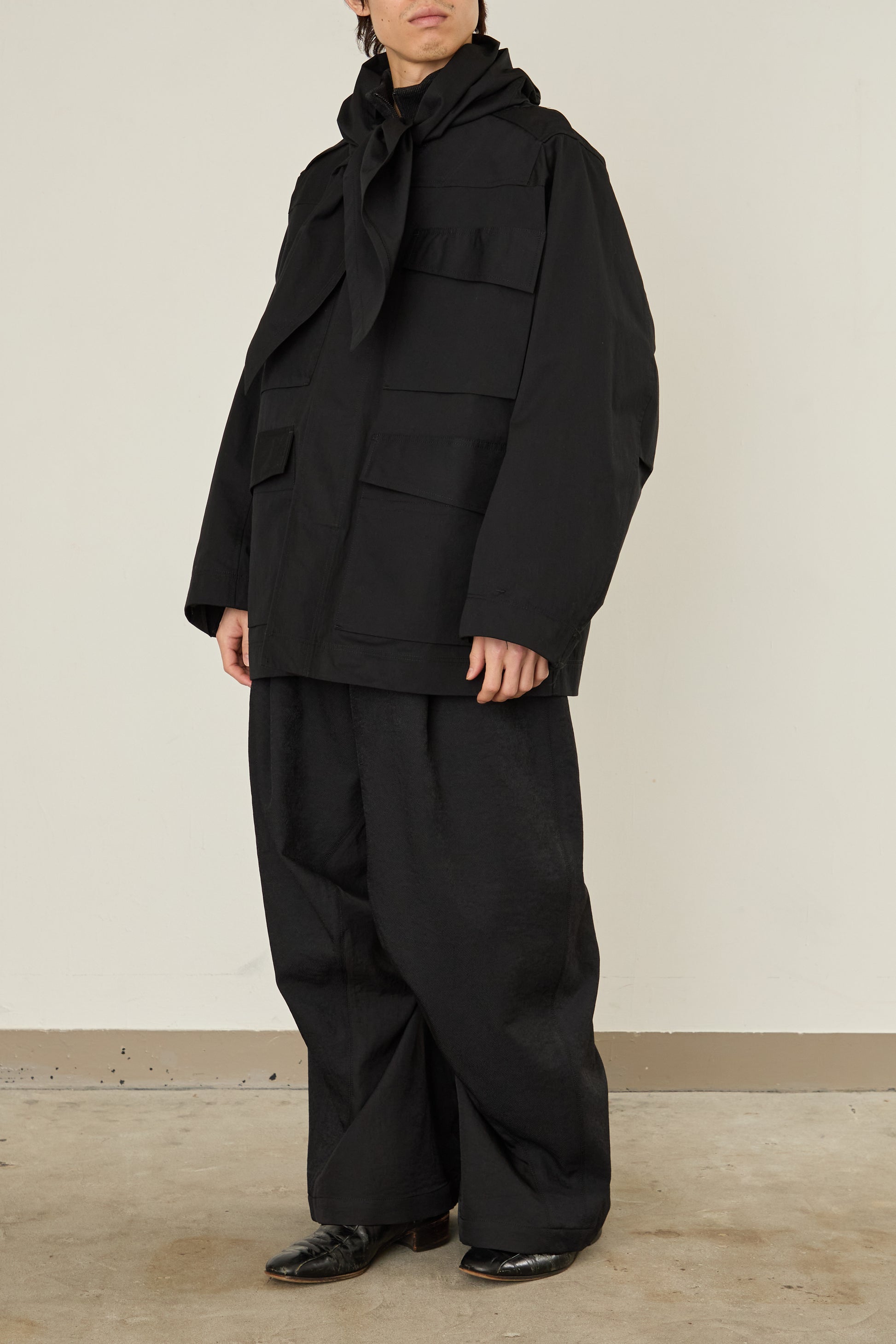 フード型ストールがドッキングされた、2WAYミリタリージャケット。