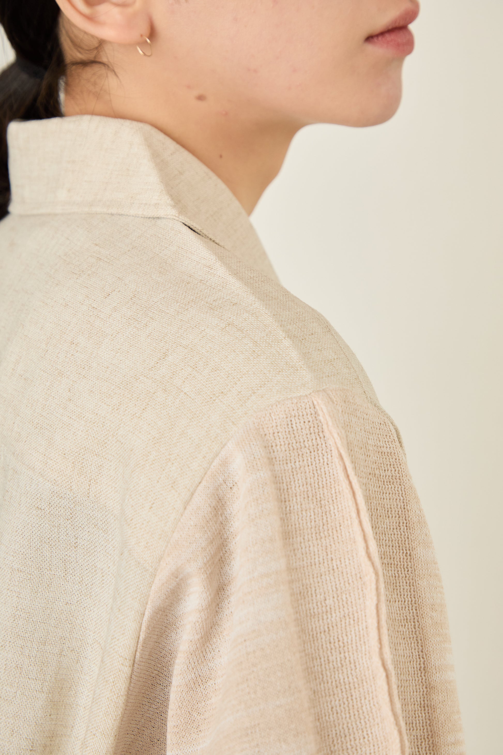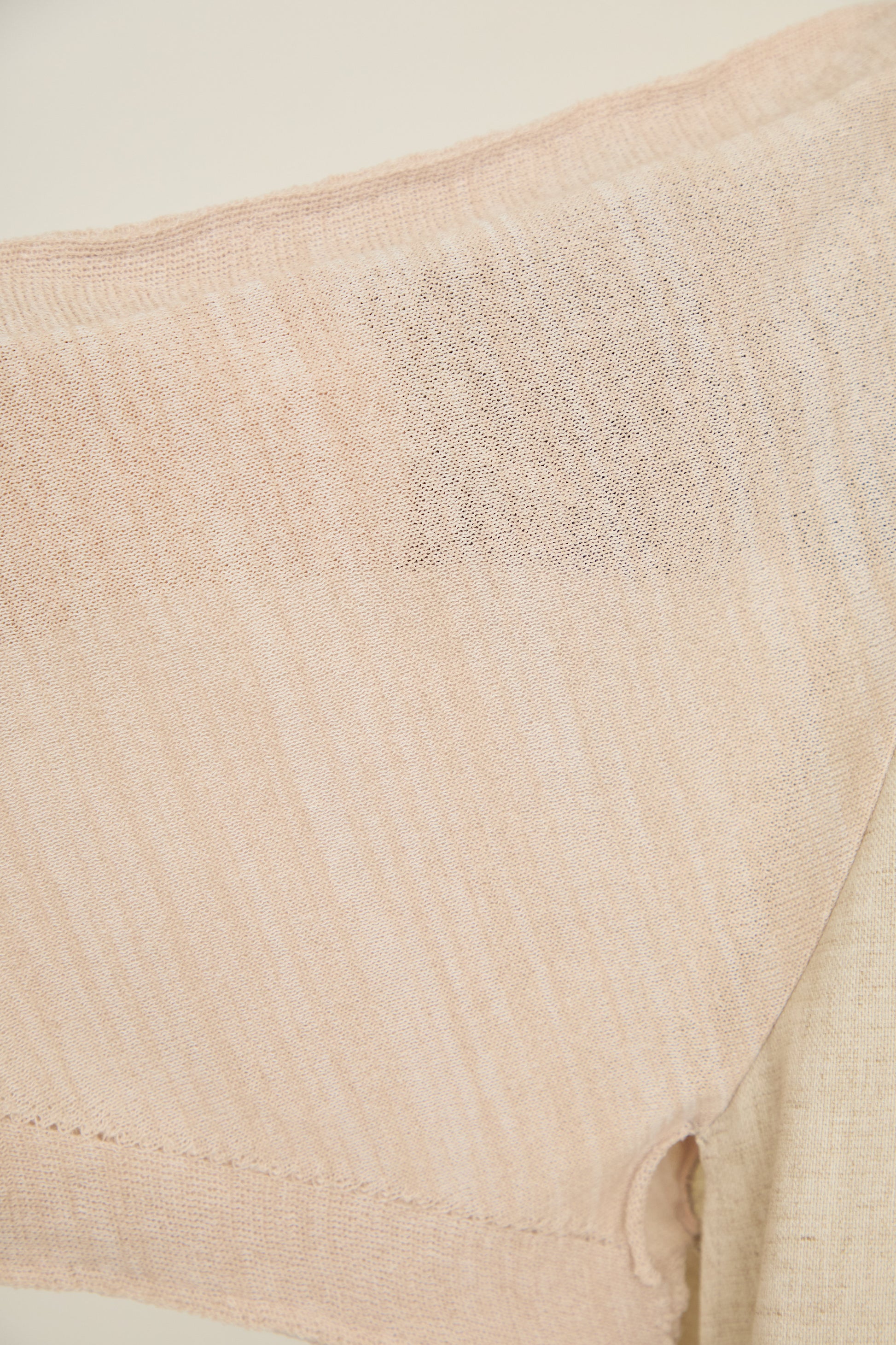 ニット袖の袖口には、編み表現でダメージ加工を施し、
