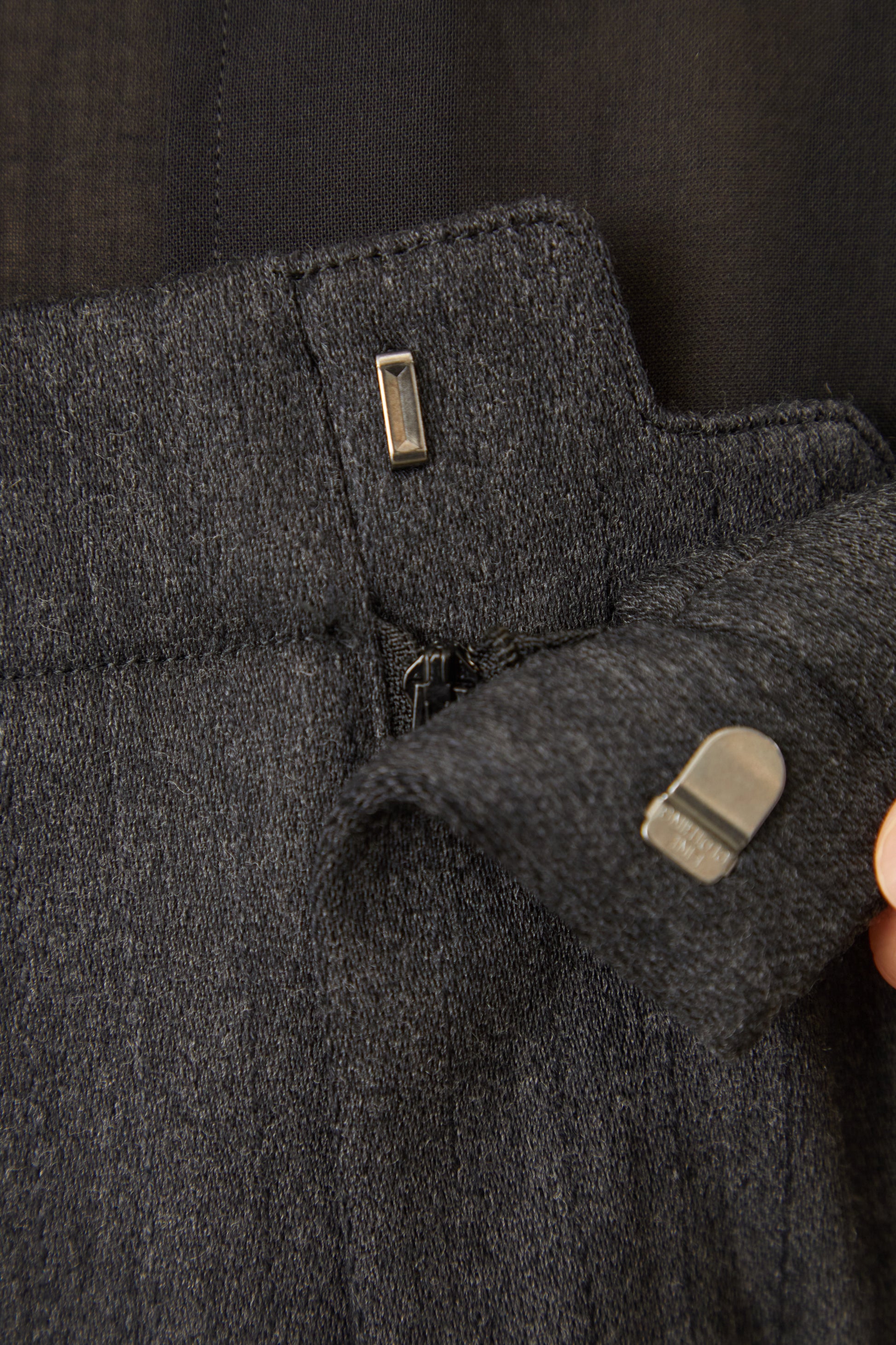 光沢のあるベネシャン素材を使⽤したテーパードスラックスパンツ。