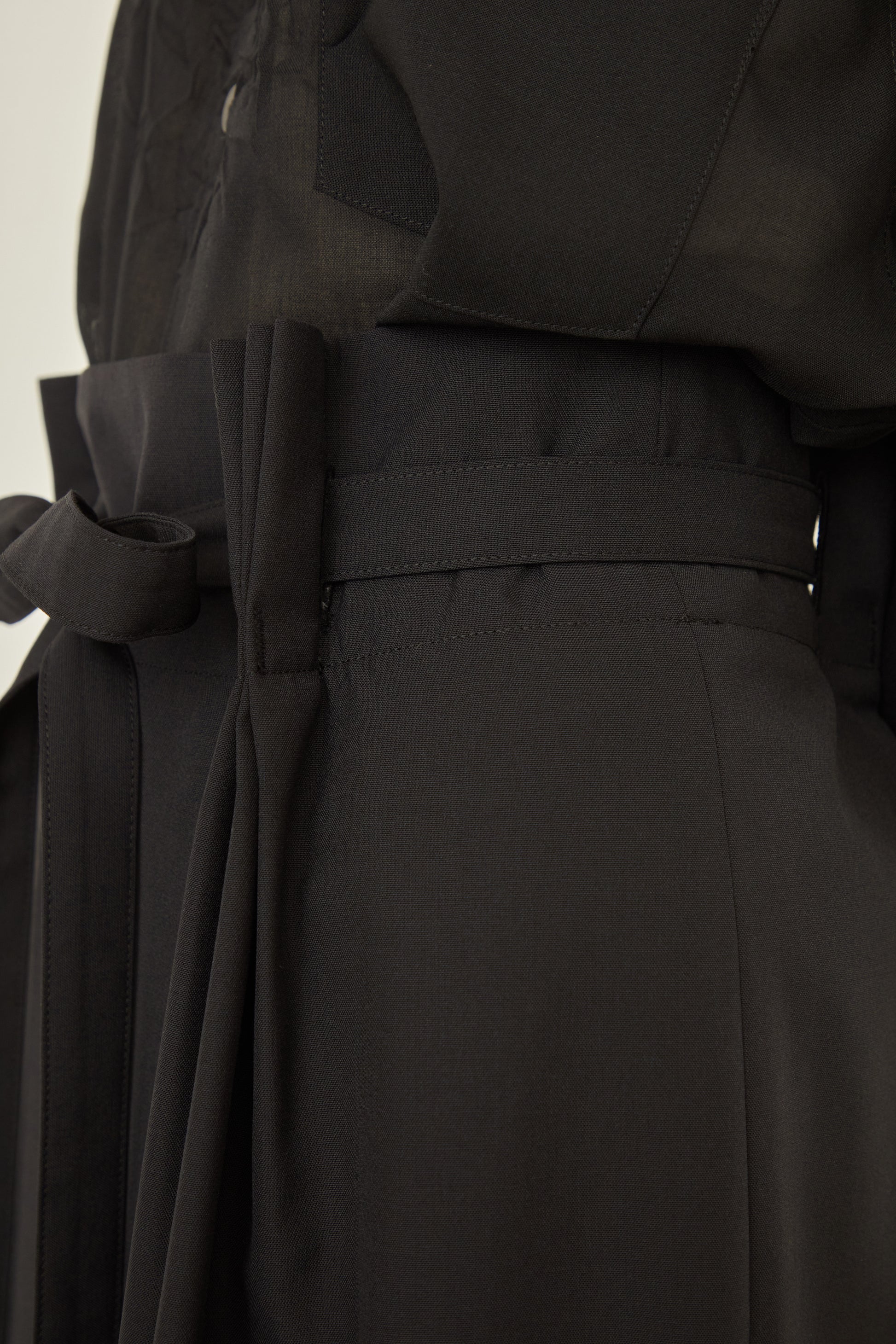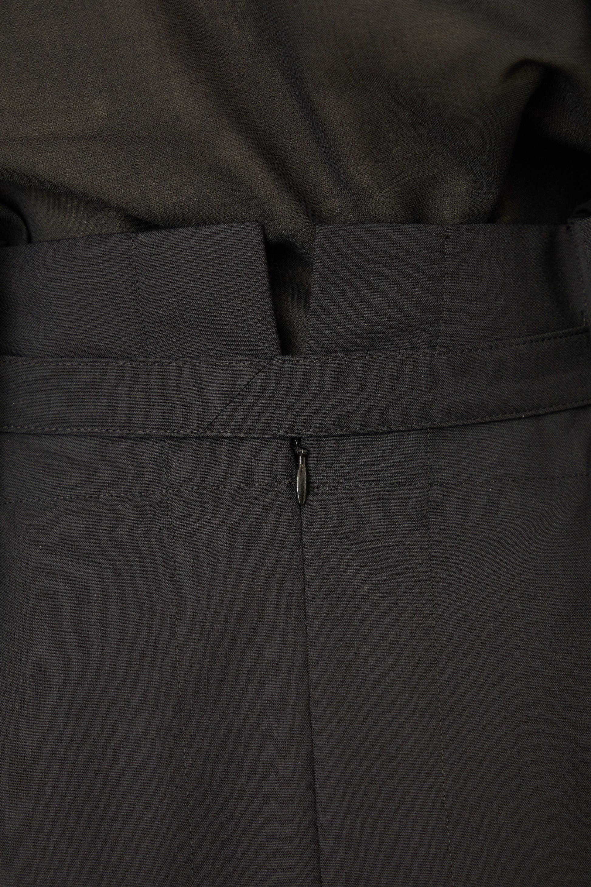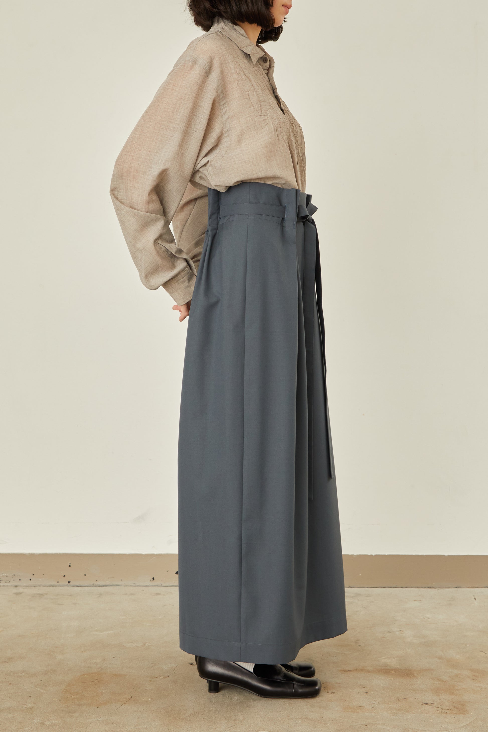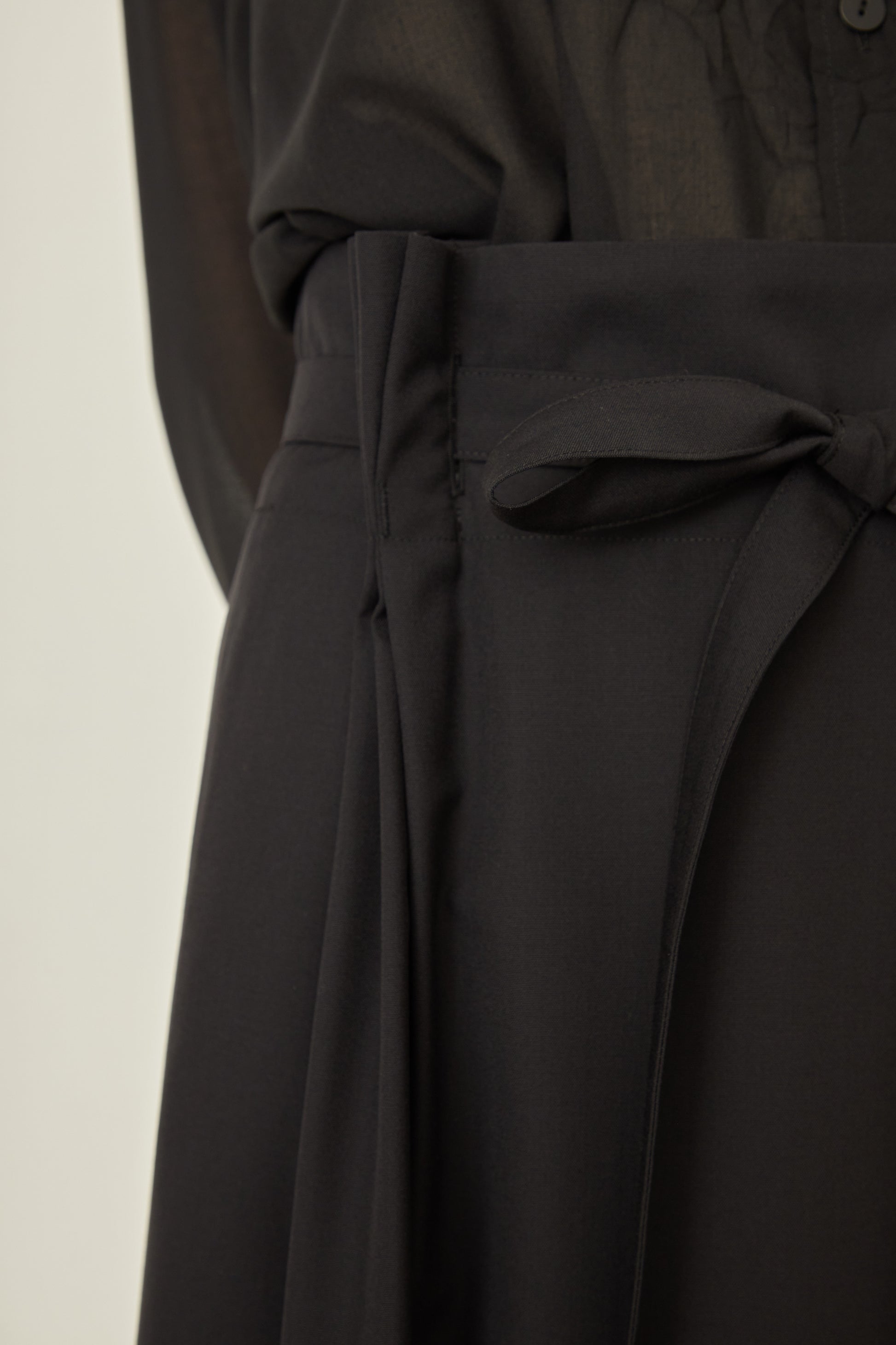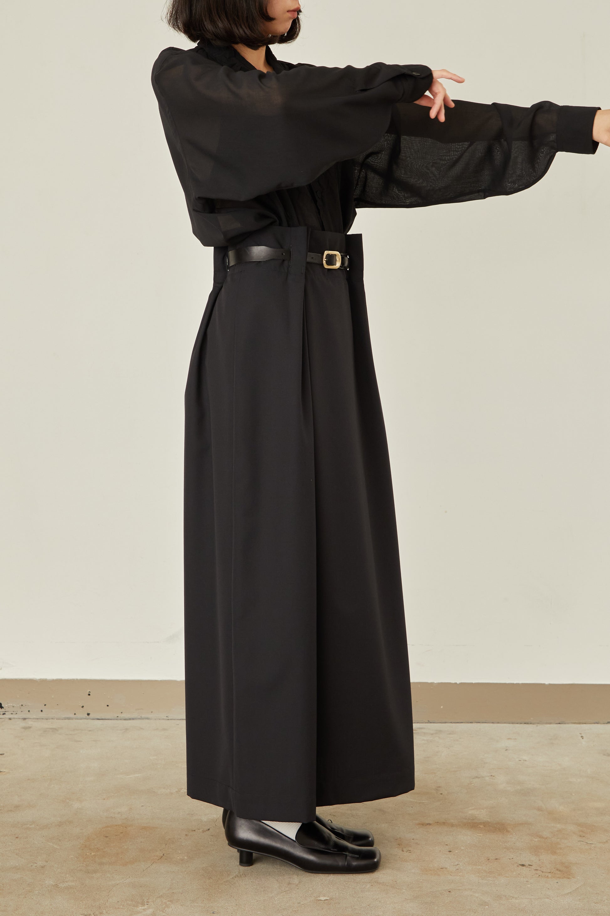 ウエストに作られた4つのプリーツには、ボタンホールで開けられたスリットがあり、共布のウエストベルトが通されています。